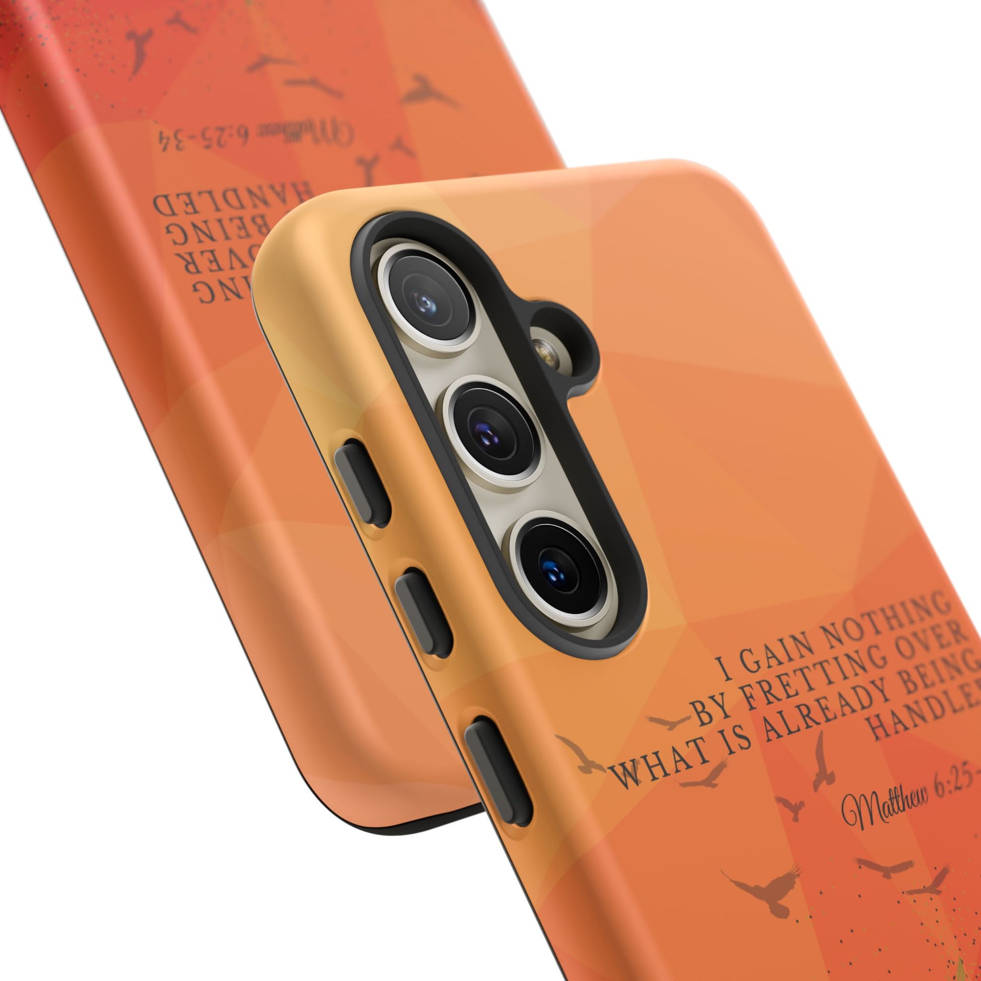 Based on Matthew 6:25-34, 'I Gain Nothing by Fretting' Christian Phone Covers serve as a constant reminder to trust in God's provision. Jesus' words in this passage encourage us not to worry about our lives, but to have faith that our Heavenly Father knows and cares for our needs. These Bible quote phone cases capture this powerful message, urging you to let go of anxieties and trust in God's control. Available for Pixel, Samsung, and iPhone, these cases are crafted with a dual-layer design for added durability. Choose from a glossy or matte finish and carry this truth with you, allowing your phone case to be a beacon of faith and a source of peace amid life's worries.