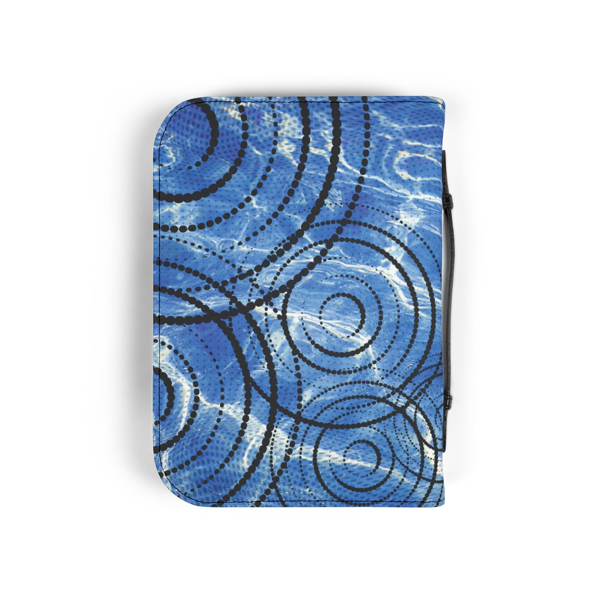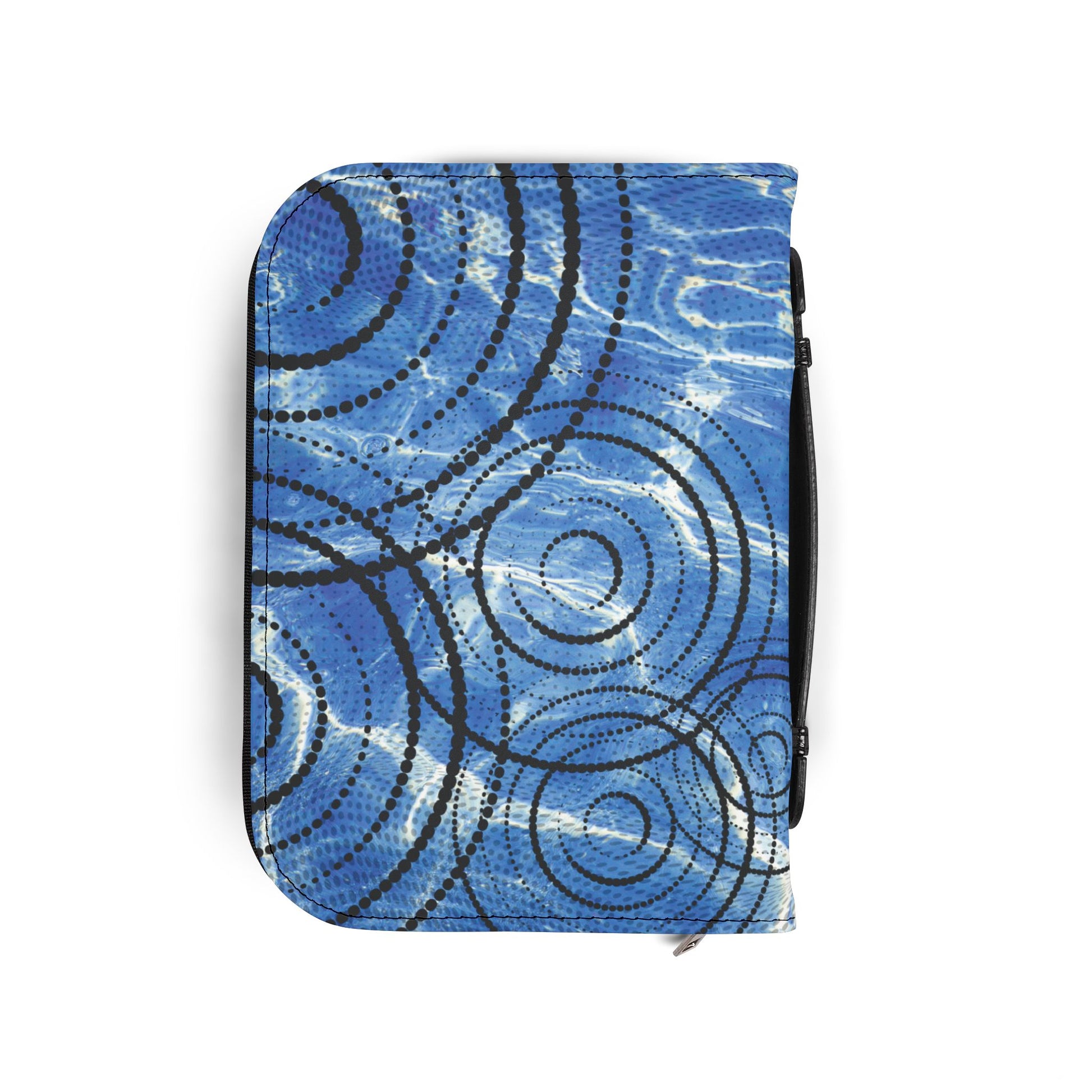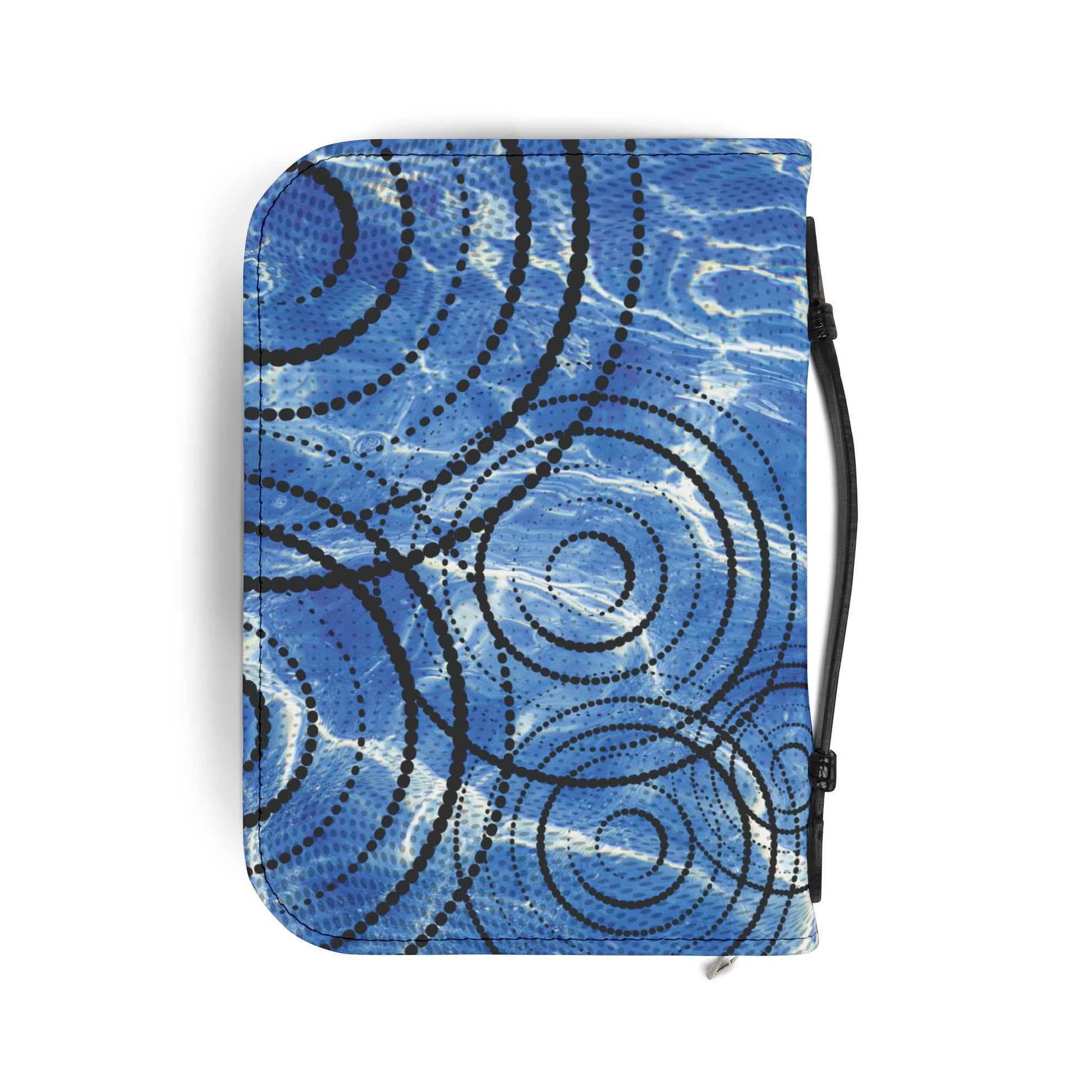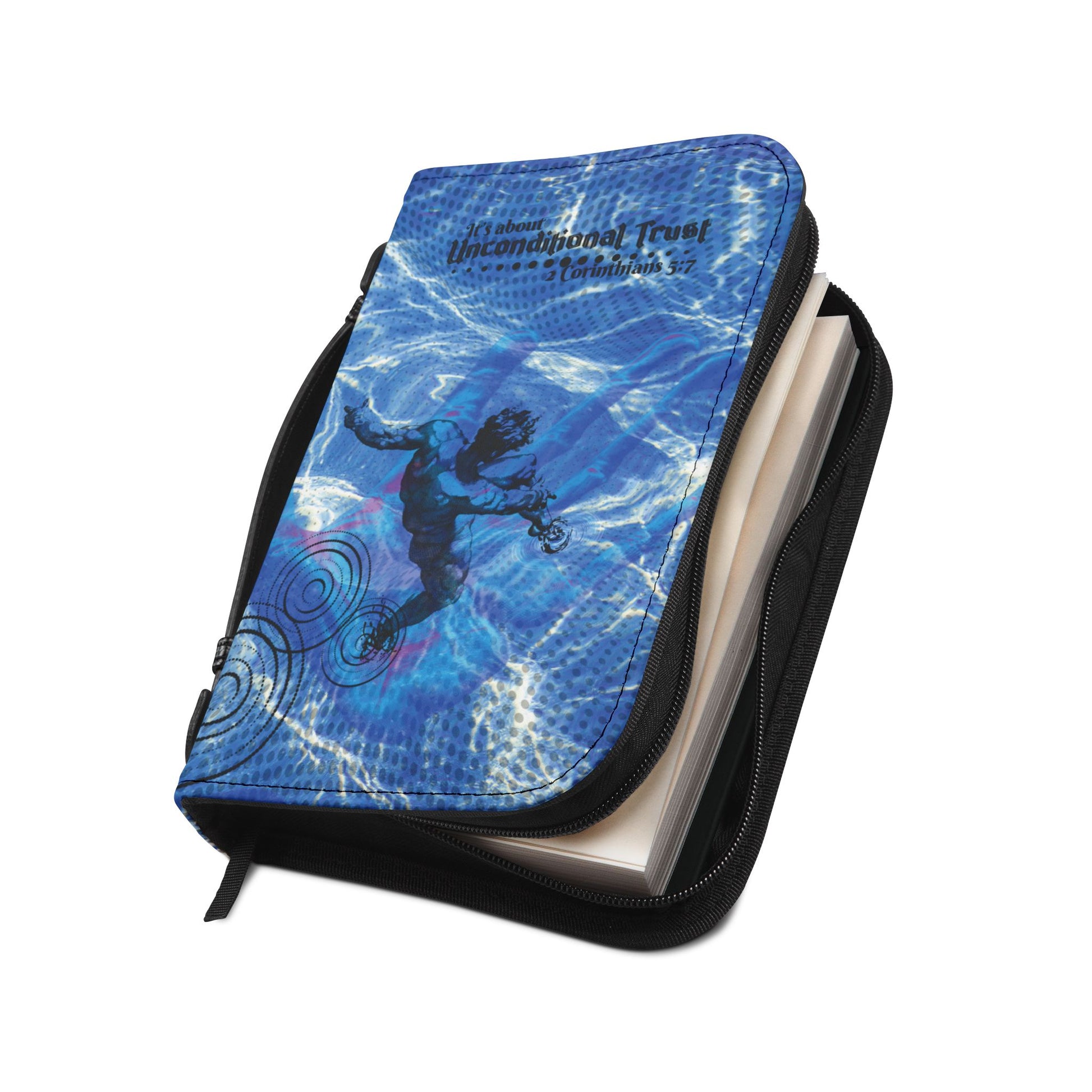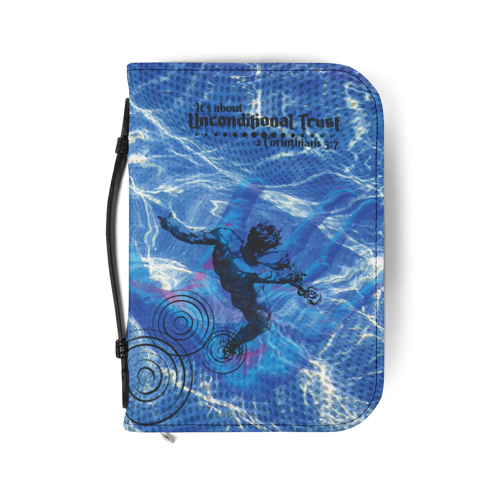 This Bible cover captures the journey of walking by faith, not by sight, inspired by 2 Corinthians 5:7. A lone figure steps across rippling waters, leaving a trail of trust behind him. Beneath his every step, a divine hand holds steady—blending into the water, unseen to the eye but known by the heart.